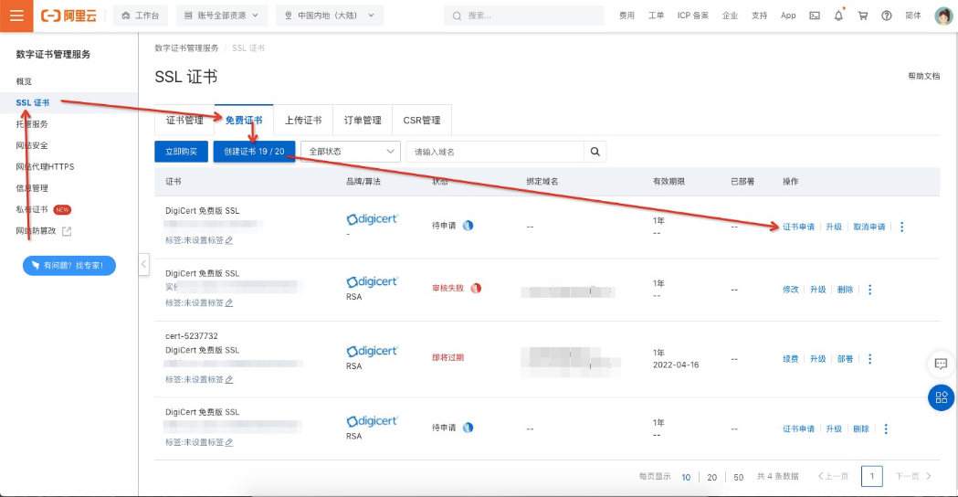 3、在证书申请页面,单击免费证书-创建证书-证书申请,按提示填写证书绑定域名等信息后,等待审核通过(审核通过时间预计10分钟)。